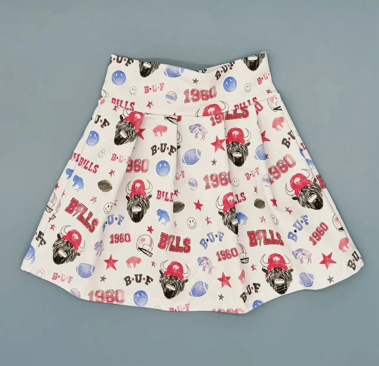 Your little one will steal the show in this adorable Buffalo-inspired twirl skirt! Featuring bold red, white, and blue graphics, playful buffalo prints, and that perfect pop of vintage “1960” pride—this piece is made for mini fans who love to stand out.