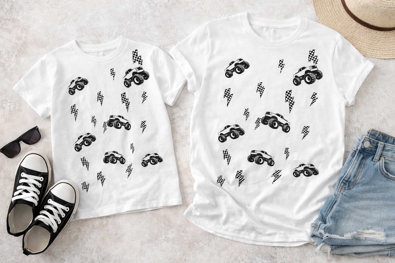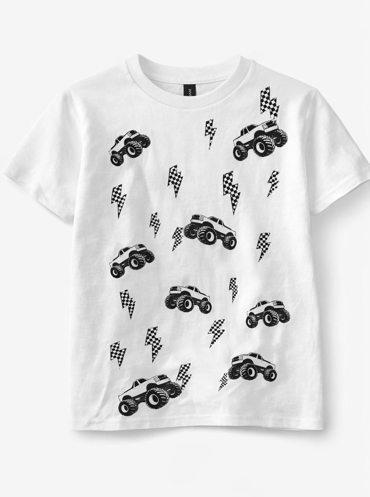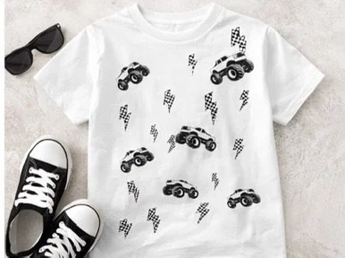 For the cool moms and their truck-loving little dudes—this matching shirt set is the perfect mix of trendy and playful. Featuring bold black monster trucks and checkered lightning bolts, these tees are made for making memories in style.
